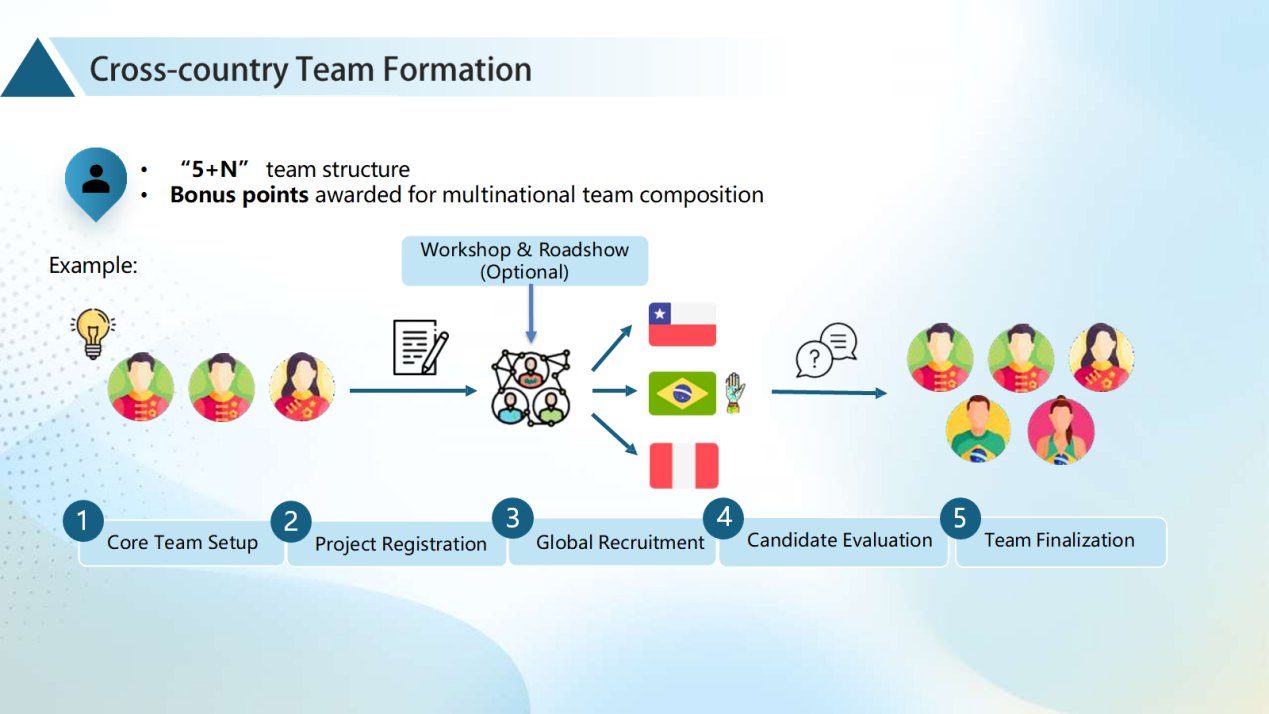 • Team nationality composition: In principle, all team members shall not be from a single country. Teams with students from China and different Latin American countries (e.g., Brazil, Chile, etc.) will receive a "Cross-cultural Bonus" in the preliminary round and the transnational final, and have the opportunity to win the "Cross-cultural Competence Award" in these stages!