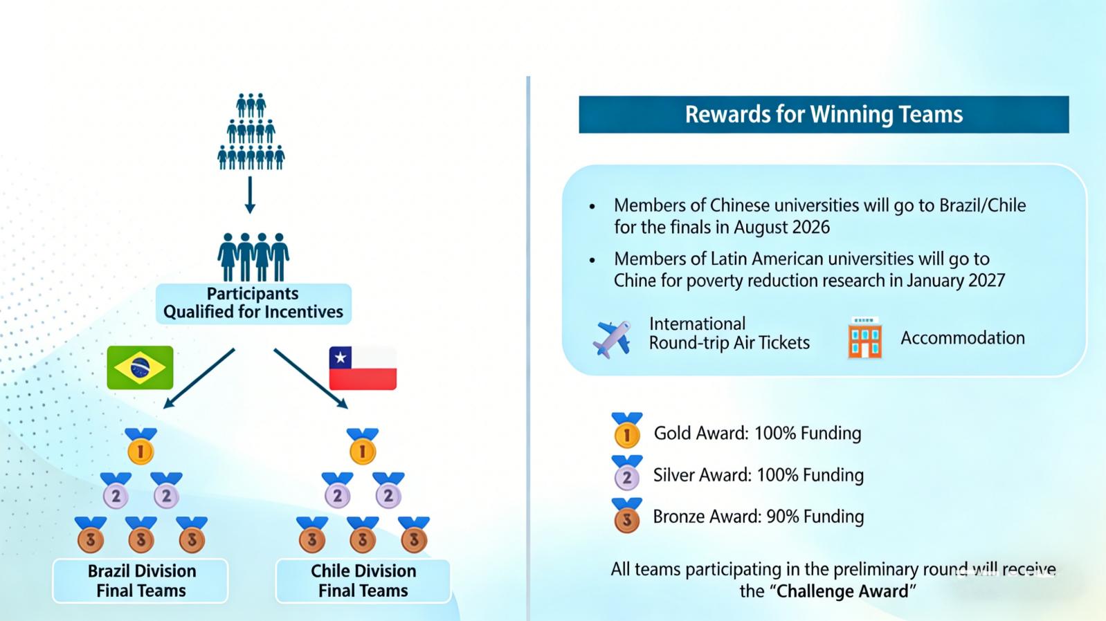 Example: A total of 100 teams participate in the 2026 Poverty Alleviation Challenge Preliminary Round, all receiving the "Challenge Award". Among them, participants with the incentive qualification are eligible for a 70% reimbursement of the total cost of accommodation and international flights. In the transnational final stage, Gold, Silver and Bronze Award teams are selected in the Brazil and Chile divisions respectively: