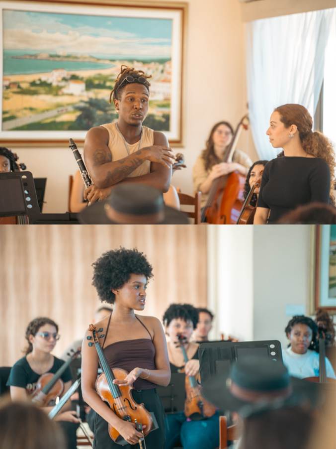 中国海油巴西公司综合支持部经理林庆熠向来访师生介绍了乐团的背景与发展——自2011年成立以来,这支民间乐团始终优先招收来自最贫困家庭的孩子,通过系统的音乐培训为他们打开新的人生道路。乐团的日常运营依靠社会捐赠,其中中国海油巴西公司是最主要的资助方。在2022年疫情冲击最严重的时期,中国海油的援助让乐团渡过难关,也由此开启了乐团与中国文化的深度交流。乐团一直在履行鼓励新人才和传播音乐文化的职责,使得音乐真正成为社会包容和专业培训的工具。正是因为音乐,来自不同社会阶层的孩子才有机会相聚在同一个舞台上,获得平等的培训和发展的机会。