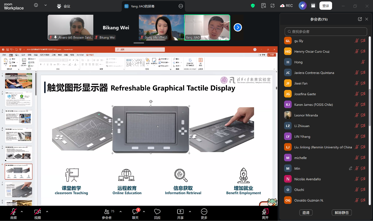 清华大学无障碍发展研究院院长邵磊首先介绍了研究院的概况及其在政策咨询、技术创新、教育实践、中国无障碍环境建设立法等方面的成果。以此为基础,研究院国际事务主管原源发布了2026减贫营在包容性发展领域的五个青年创新命题,涵盖盲文辅助教育、残障女性健康信息、非正规就业数字服务、离线AI教学辅助及儿童早期发展干预等方向,为中拉青年跨国组队选题提供引导。作为技术支撑案例,清华大学未来实验室、无障碍发展研究院的焦阳老师介绍了其原创性成果——为视障人群开发的触摸显示器。该设备已在北京盲人学校成功试用超过100小时,展现出在教育、博物馆、图书馆及公共空间的应用潜力。命题具体包括: