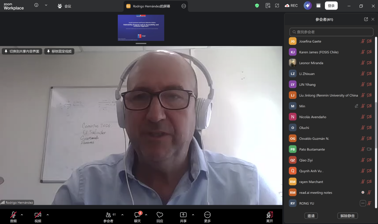 智利社会团结与投资基金(FOSIS)健康居住环境部主任 Rodrigo Hernández分享了智利宜居方案在改善弱势群体住房条件方面的工作,并围绕贫困社区、青少年、残障群体的实际需求,介绍了无障碍设施准入标准、政府支持政策与项目落地条件等内容,为相关技术转化与本地化应用提供了重要参考。