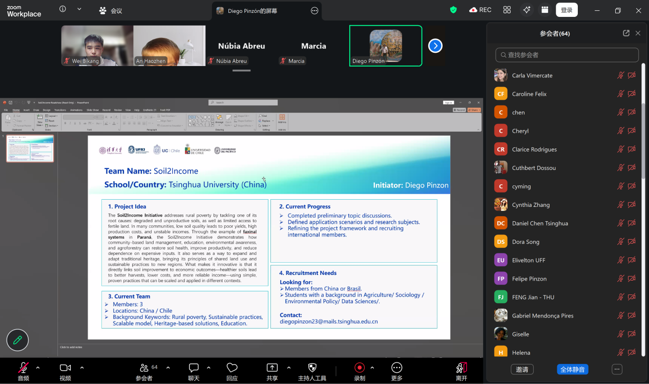 为深化中拉青年减贫协作、推动多元减贫创新方案向实践转化,减贫营首次路演于2026年4月21日北京时间20:30以线上形式顺利召开。本次路演荣幸邀请到在巴西的核心合作方—— 里约热内卢联邦大学理工学院外事副院长José Orlando Gomes教授线上参会,为中拉青年减贫协作提供指导与支持。首次路演吸引了来自清华大学、里约热内卢联邦大学、里约热内卢州立大学、弗鲁米嫩塞联邦大学的7支青年团队线上参与,参会人数达70余人。来自牛津索菲亚智慧响应者组织——Wise Responder和巴西淡水河谷公司(Vale)及智利社会团结与投资基金(FOSIS)的代表云端相聚。开展中拉青年减贫协作与精准组队筹备,为 2026 减贫营跨国组队与项目转化奠定坚实基础。本次路演由清华大学拉美中心团队主持。