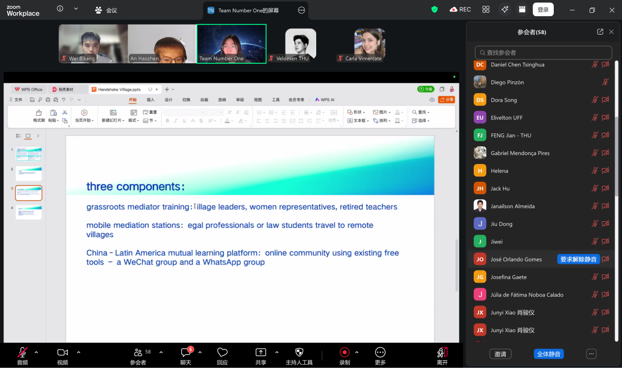 清华大学的Number One 团队致力于打造“握手村”低成本法律调解网络,通过基层调解与流动服务站保障乡村弱势群体权益、预防返贫,正开展中外调解实践对比研究,面向拉美招募关注基层减贫的合作伙伴。