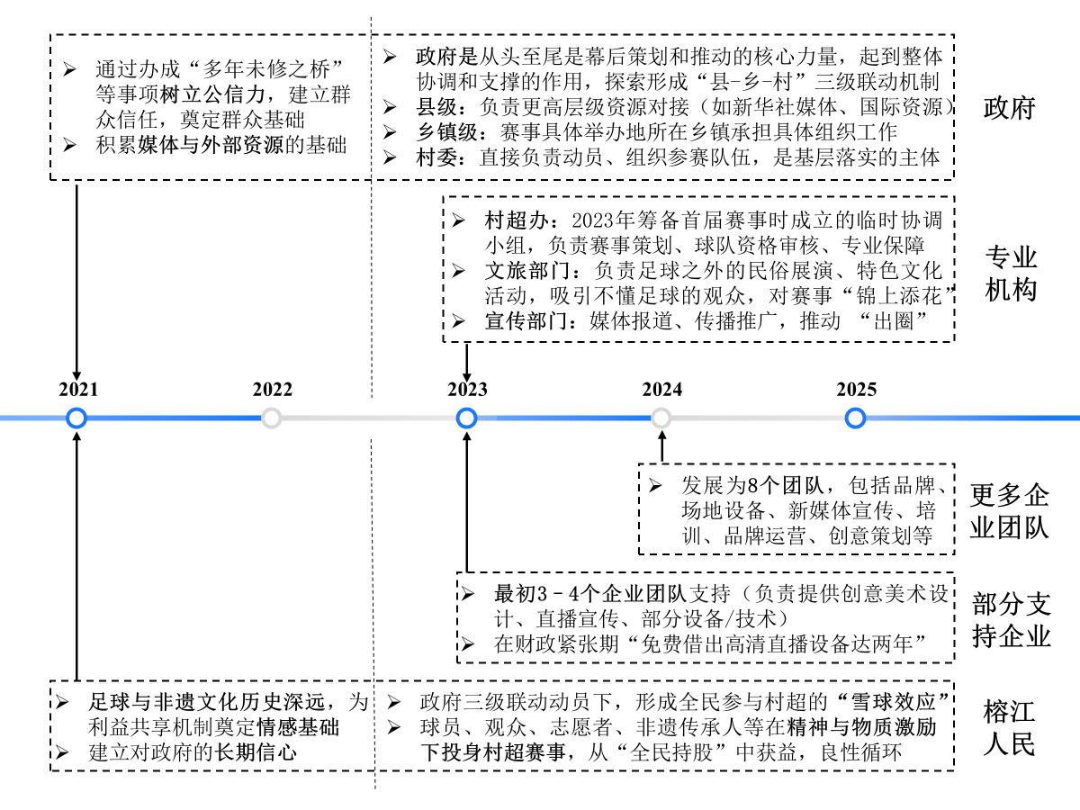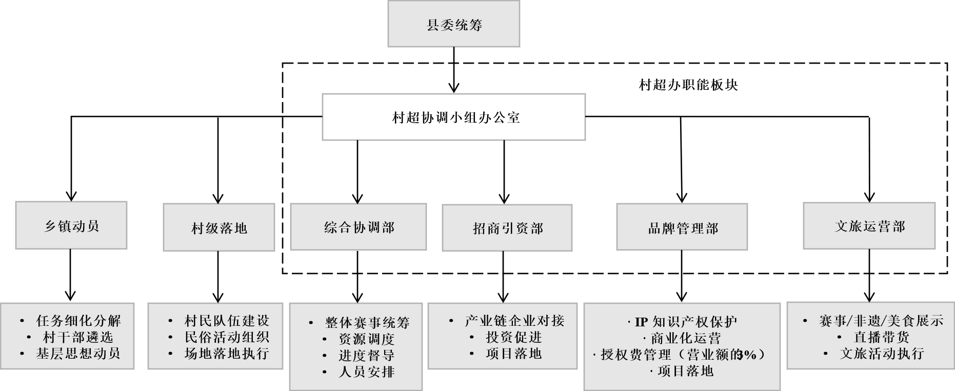 在“村超”发展历程中,政府发挥了一以贯之的关键作用。虽然榕江县政府并未刻意站到台前,但县委、县政府、乡镇和村委共同构成了坚实的制度支撑,保证了赛事的顺利开展。例如,在宣传和外部资源的引入上,政府发挥了不可替代的作用:县政府积极联系新华社、人民日报等官方媒体乃至国际媒体,为“村超”的知名度提升提供了有力支持。正是这些前期工作,使得赛事在尚未形成规模时,媒体愿意走进榕江,为活动积累了初始声量。同时,政府内部不同层级在职能分工上各有侧重:县级层面主要负责对接更高层次的资源,进行整体协调;乡镇层面则承担具体执行任务,如古州镇就负责场地保障、社区调动和特色展览、美食活动等;而村委会则发挥着最贴近基层的作用,直接组织球队、动员群众。在政府提供整体统筹和资源保障的基础上,赛事的具体筹备与执行需要更加专业化的机制来承接,于是村超办应运而生。村超办的前身是2023年为筹备首届“村超”联赛而设立的临时协调小组,以榕江县委书记及县长为核心牵头,从榕江县委县政府各部门抽调骨干组成,主要任务是赛事的策划和专业化管理,解决赛事筹备中的部门协作难题、保障“村超”的顺利开展。随着赛事影响力扩大、“村超”赛事逐渐稳定,其转变为常设机构,拥有服务保障“村超”顺利开展的跨部门资源调度权,并逐步形成综合协调、招商引资、品牌管理、文旅运营四大职能板块。在村超办的四大职能板块中,综合协调部门负责整体赛事统筹与资源调度,对接及汇报关于“村超”的进度督导、人员安排及材料准备;招商引资部门负责吸引投资,开展“村超”产业链相关企业对接;品牌管理部统筹“村超”IP的知识产权保护与商业化运营,对于使用“村超”IP的合作企业按营业额的3%收取使用费,并推进全国赛事以提升“村超”IP价值;文旅运营部则负责“村超”全流程的赛事、非遗、美食的文旅展示和民俗展演、直播带货等文旅融合运营。