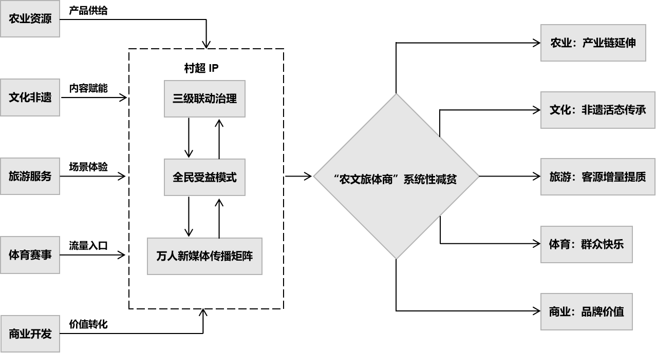 榕江县委县政府基于前五次县域文化品牌打造尝试,系统梳理人文资源闲置、产业协同不足、组织机制缺位等主要致贫因素,在第六次以“村超”为载体,定位快乐足球来协调不同主体构建起政府主导、全民参与、市场赋能的系统性减贫框架。通过三级联动治理机制、全民利益共享设计、新媒体流量转化实现农文旅体商深度融合,充分动员了全体榕江县人民群众共同打造人民足球、创建“贵州“村超””品牌,实现“让手机变成新农具、数据变成新农资、直播变成新农活”的县域品牌在新媒体广泛传播,推动县域品牌充分赋能榕江多产业发展,有效延长了榕江产业链,探索出一条欠发达山区县系统性减贫的创新路径。