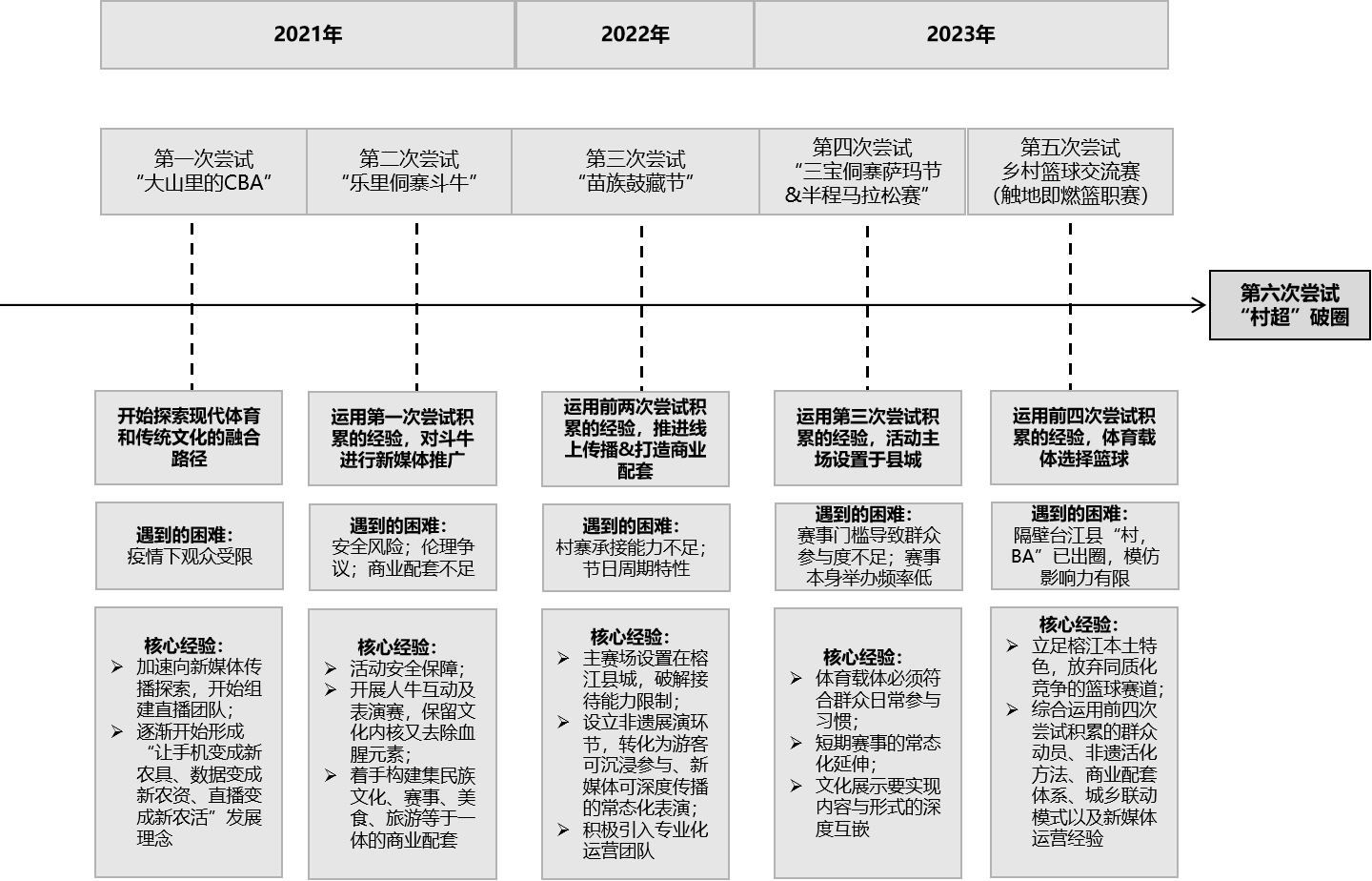 在系统梳理榕江县发展瓶颈的基础上,笔者发现其2021至2023年间以新媒体为核心抓手、连续开展的五次文化IP塑造尝试尤为关键。这一持续迭代的探索历程,构成了“村超”最终破局的内在逻辑主线。