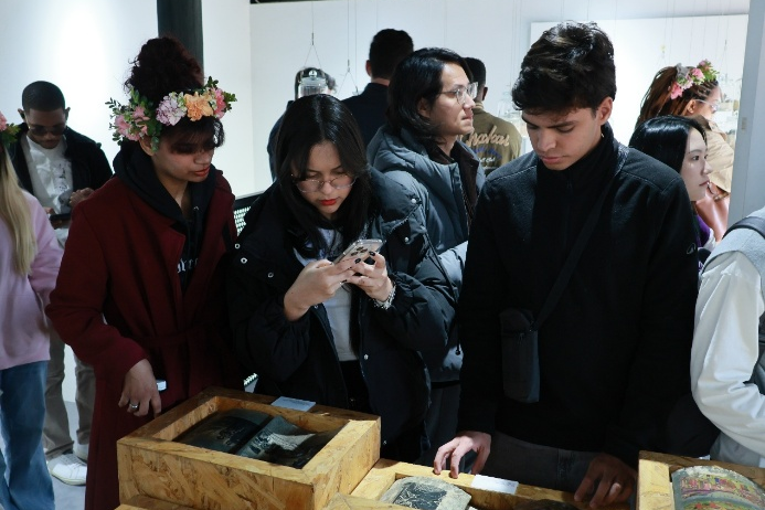在匠志集运营负责人姜林老师的引导下,中巴青年逐一探访各技艺展区,近距离观摩手作精品的细节肌理,深入了解白族手工艺“就地取材、因材施艺”的鲜明特质。从扎染所需的本土板蓝根,到造纸依赖的构树皮纤维,传统技艺与自然禀赋、民俗生活的深度绑定,让中巴青年对“文化扎根乡土”有了更直观的认知。大家不时驻足端详,轻声交流,在指尖摩挲与目光凝望中,感受中华传统文化的深厚底蕴。